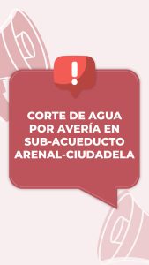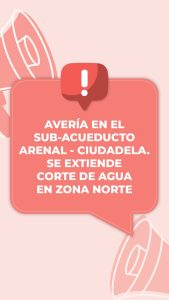 CORTE DE AGUA EN DOCE BARRIOS DE ZONA NORTE POR AVERÍA EN EL SUB-ACUEDUCTO ARENAL – CIUDADELA