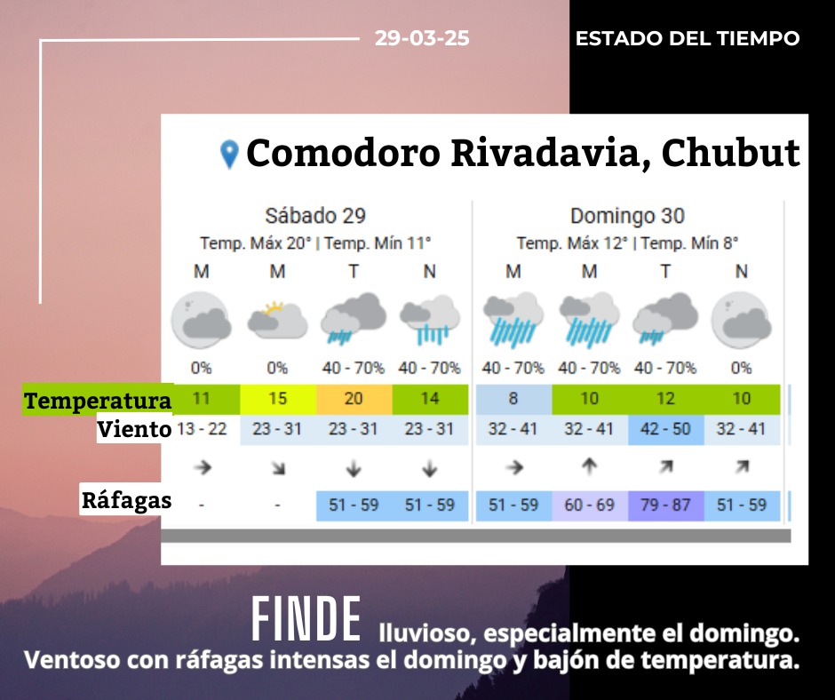 Se espera que inicie la lluvia alrededor de las 18 hs del sábado intensificándose hacia el domingo, con su mayor rigor entre las 3 y las 9 de la mañana del domingo.