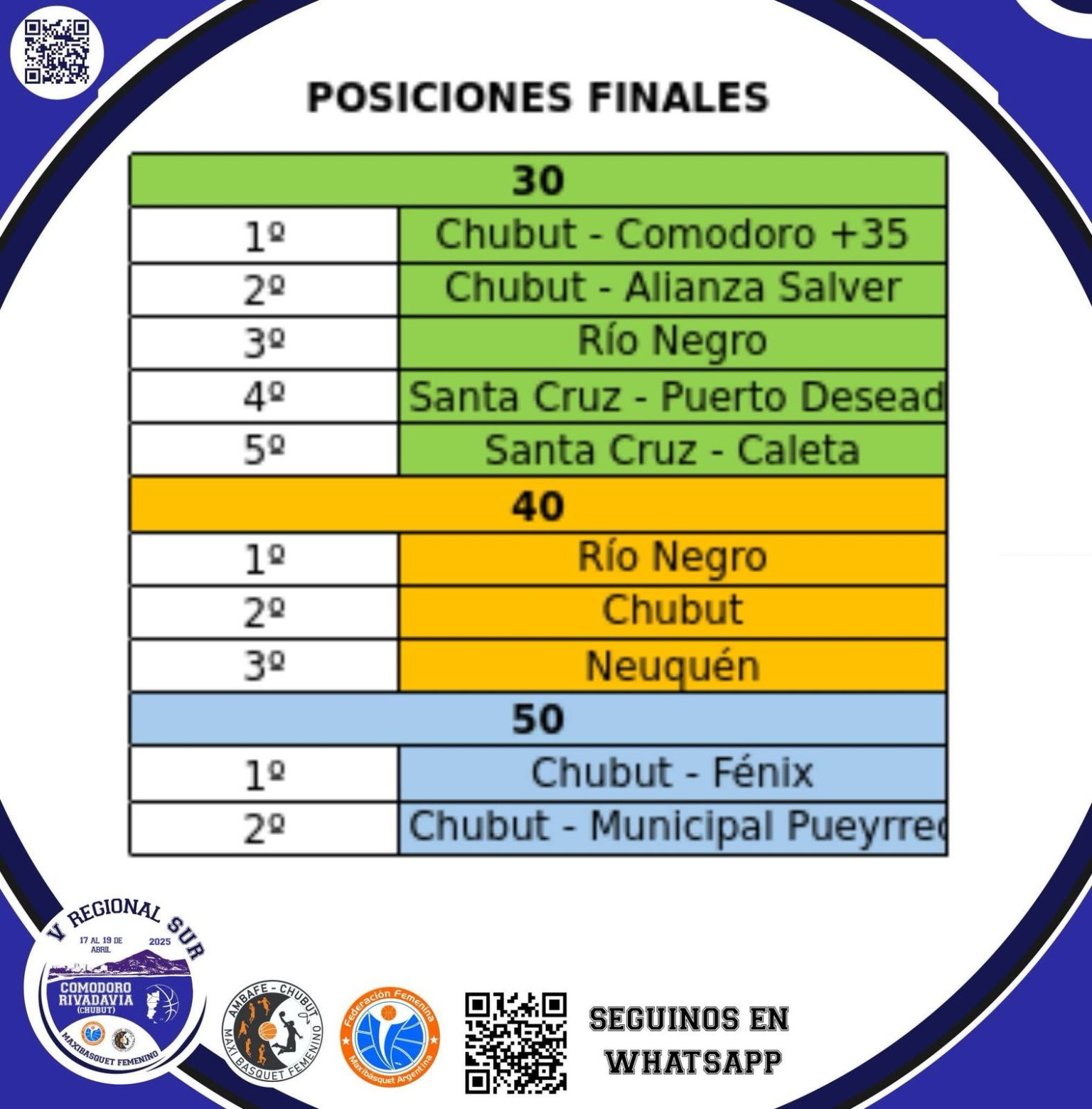 Del Jueves 17 al Sábado 19 de Abril se realizó el Torneo Regional de Maxi Básquet del Sur Femenino para las categorías +30, +40 y +50, certamen organizado por la Agrupación de Maxi Basquetbol de Comodoro Rivadavia con el aval de la Federación Argentina de Maxi Básquet Femenino.