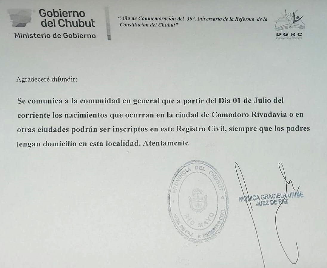 A partir de ahora, las personas con domicilio en localidades como Río Mayo o Sarmiento que tengan hijos en Comodoro Rivadavia podrán inscribirlos como nacidos en su localidad de origen.