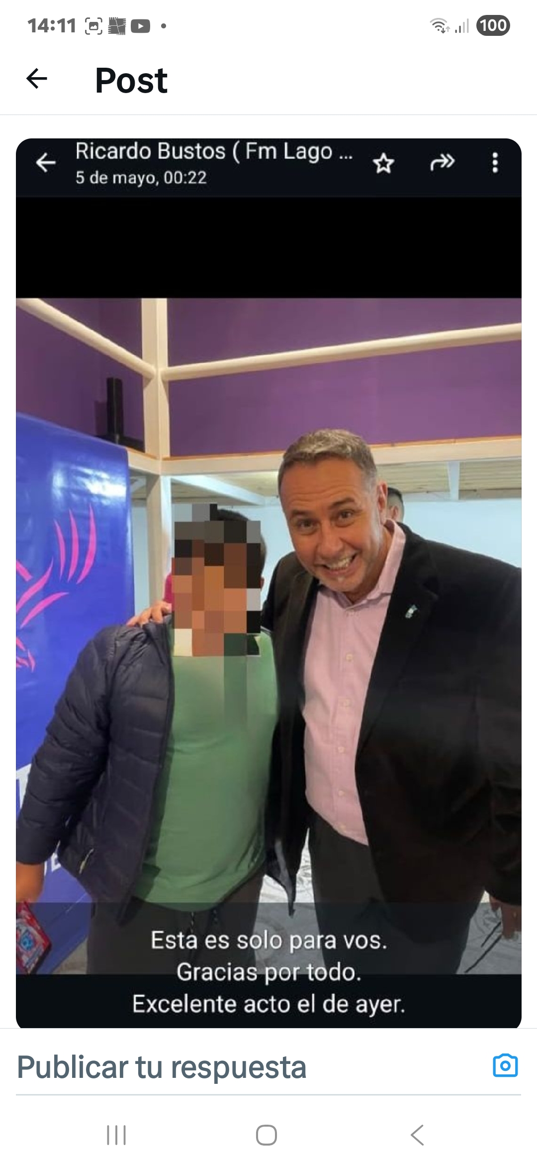 DENUNCIA PENAL RADICADA CONTRA RICARDO BUSTOS «PERIODISTA» POR EL DELITO DE «AMENAZAS HACÍA MI HIJO MENOR DE 10 AÑOS DE EDAD». SUBO SOLO A MODO DE EJEMPLO UNA FOTOGRAFÍA ( PRUEBA 1 DE 10 QUE ACOMPAÑAN LA DENUNCIA REALIZADA Y QUE PROBABLEMENTE SEA AMPLIADA SI SE INCUMPLE LA CAUTELAR) EN LA FOTO POSA BUSTOS JUNTO A MI HIJO (NIÑO DE 10 AÑOS DE EDAD) HACIENDOSE SACAR UNA FOTOGRAFÍA SIN AUTORIZACIÓN NI PERMISO DE SUS PADRES ( NI DE NADIE) ACCIÓN PREMEDITADA, DADO QUE 1 DÍA DESPUÉS, PROCEDIO A ENVIARLA A MI TELEFONO PERSONAL AMENAZANDO. LAMENTABLEMENTE DEBO IMFORMAR DEL TEMA ( A LOS FINES DE EVITAR QUE ESTA PERSONA, YA DENUNCIADA PENALMENTE, SIGA MINTIENDO Y ENGAÑANDO PERSONAS QUE DESCONOCEN ESTA INFORMACIÓN) R. BUSTOS, YA FUÉ NOTIFICADOE POR EL MINISTERIO PUBLICO FISCAL, MEDIANTE LA POLICIA DE ESQUEL, DE UNA MEDIDA CAUTELAR CON UNA SERIE DE MEDIDAS QUE DEBE CUMPLIR EN FUNCIÓN DEL DELITO POR EL QUE FUÉ DENUNCIADO. ( ENTRE VARIAS MEDIDAS, TAMBIÉN ESTA INCLUÍDA LA PROHIBICIÓN DE ACERCAMIENTO A MI PERSONA, MI PEQUEÑO DE 10 AÑOS Y RESTANTE GRUPO FAMILIAR) EN LA DENUNCIA RADICADA. SERÁ JUSTICIA! COMO BIEN DICE NUESTRO PRESIDENTE @JMilei: NO ODIAMOS LO SUFICIENTE A LOS PERIODISTAS…CLARAMENTE ESTE INDIVIDUO ÍNTEGRA EL 90 % AL QUE SE REFIERE SIEMPRE EL PRESIDENTE. NUNCA MEJOR DEFINIDO … EL QUE LAS HACE, LAS PAGA!!!