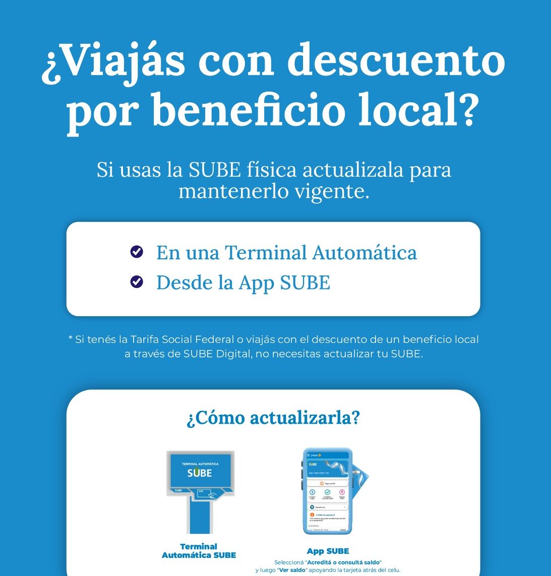 Asimismo desde el Ministerio de Gobierno se indicó que quienes acceden a beneficios locales como BECH, descuento por discapacidad, empleado público, IPP o COSE, deberán actualizar su tarjeta SUBE física para que los descuentos sigan aplicándose correctamente.