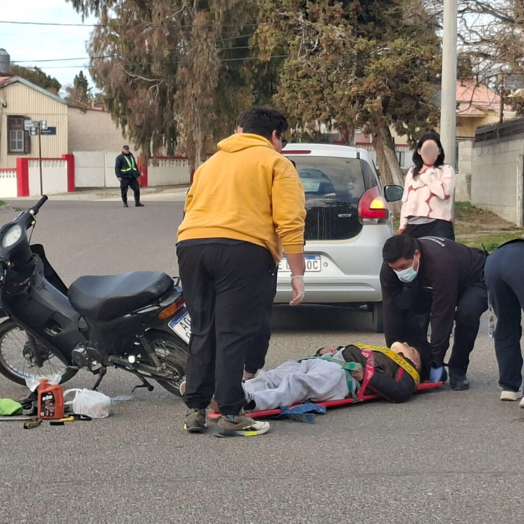 En esta ocasión los involucrados en el accidente vial son una moto y un auto, fue en la intersección de calle Piedrabuena y Roca, detrás del Registro Civil de Km 3.