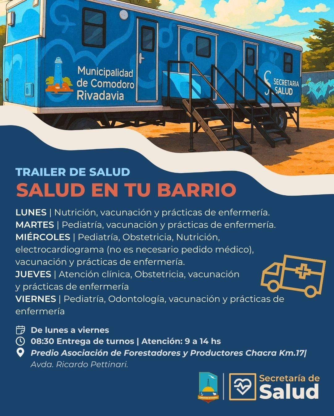 El tráiler funcionará en el predio de la Asociación de Forestadores y Productores de Chacra Km.17, sobre la avenida Ricardo Pettinari. Entre las prestaciones gratuitas, se contemplan controles pediátricos, clínica médica, odontología, vacunación, obstetricia, nutrición, vacunación, electrocardiogramas y prácticas de enfermería.