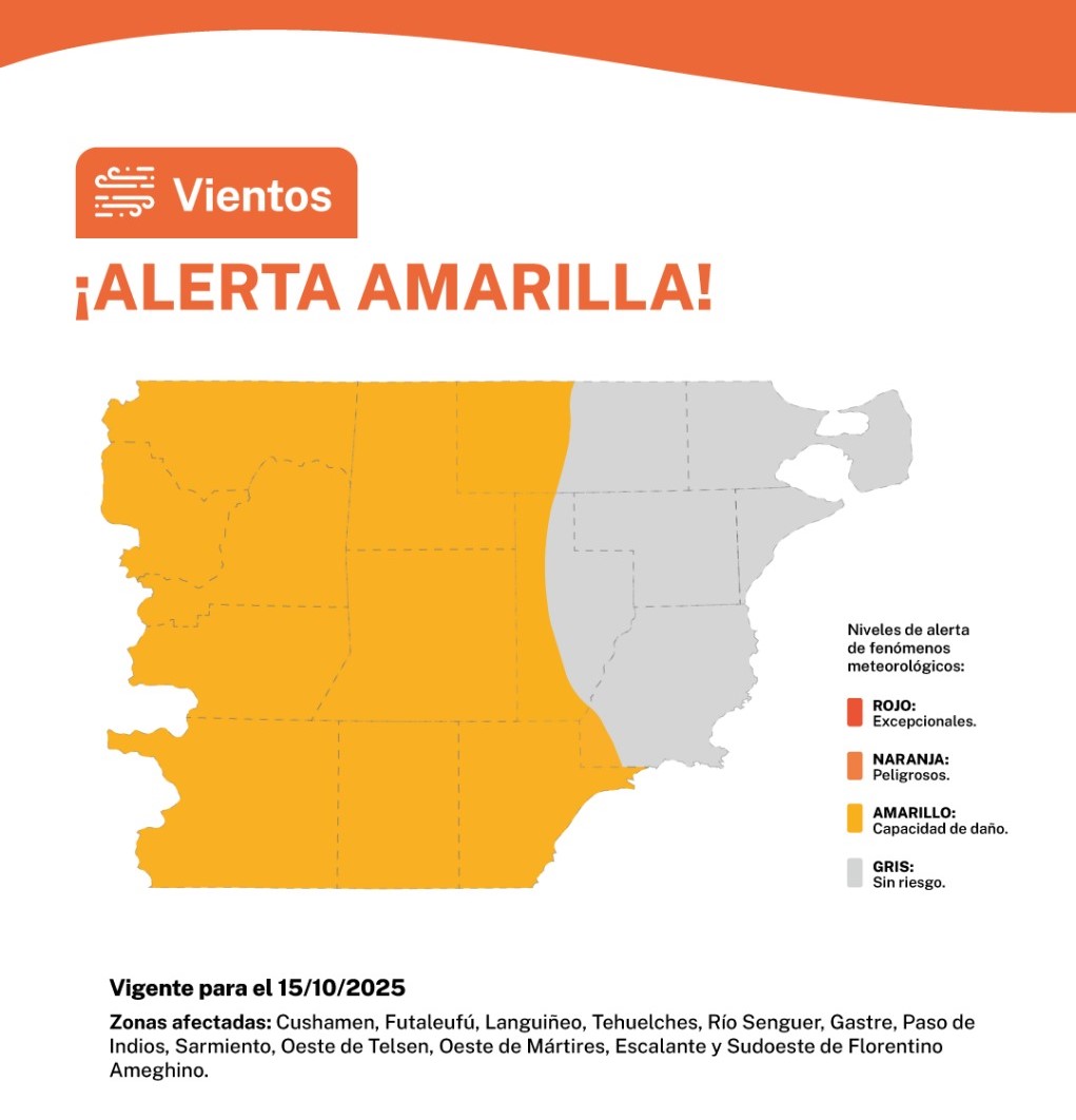 En Chubut, Río Negro y Neuquén, el área será afectada durante la tarde por vientos del sector oeste con velocidades entre los 40 y 60 km/h, con ráfagas que pueden alcanzar los 90 km/h, pudiendo ser superadas de manera local.