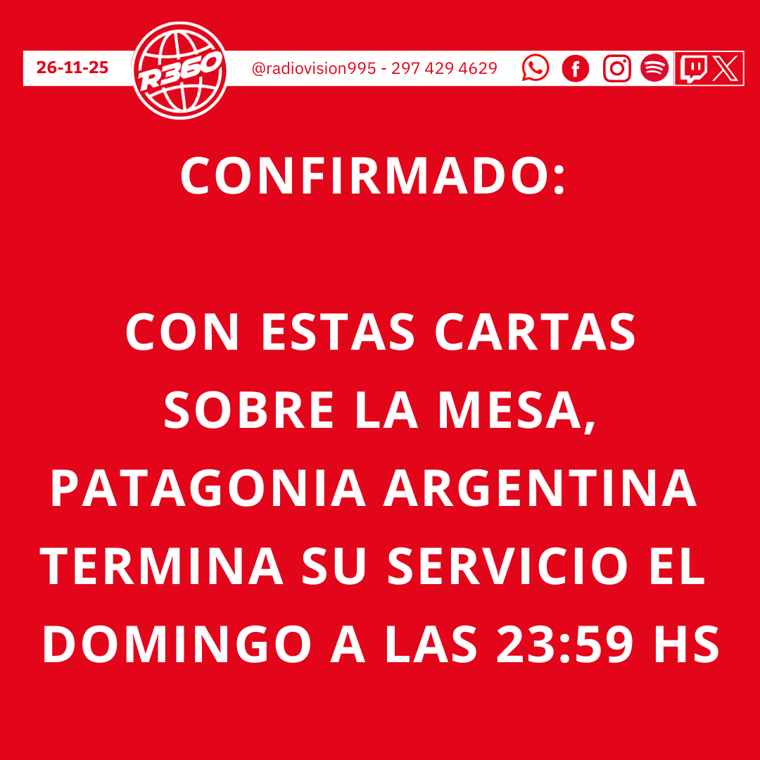 Comodoro Último momento!! 26 de noviembre de 2025 1:18 pm R360 Share 0 Min Read Esto lo confirmó el gerente de Patagonia Argentina, Jorge Moreno en diálogo con La Mañana de Hoy. Share This Article Facebook Twitter Whatsapp Whatsapp Copy Link Previous Article Transporte público y prórroga pendiente Next Article Ignacio Torres entregó equipamiento escolar en Rawson