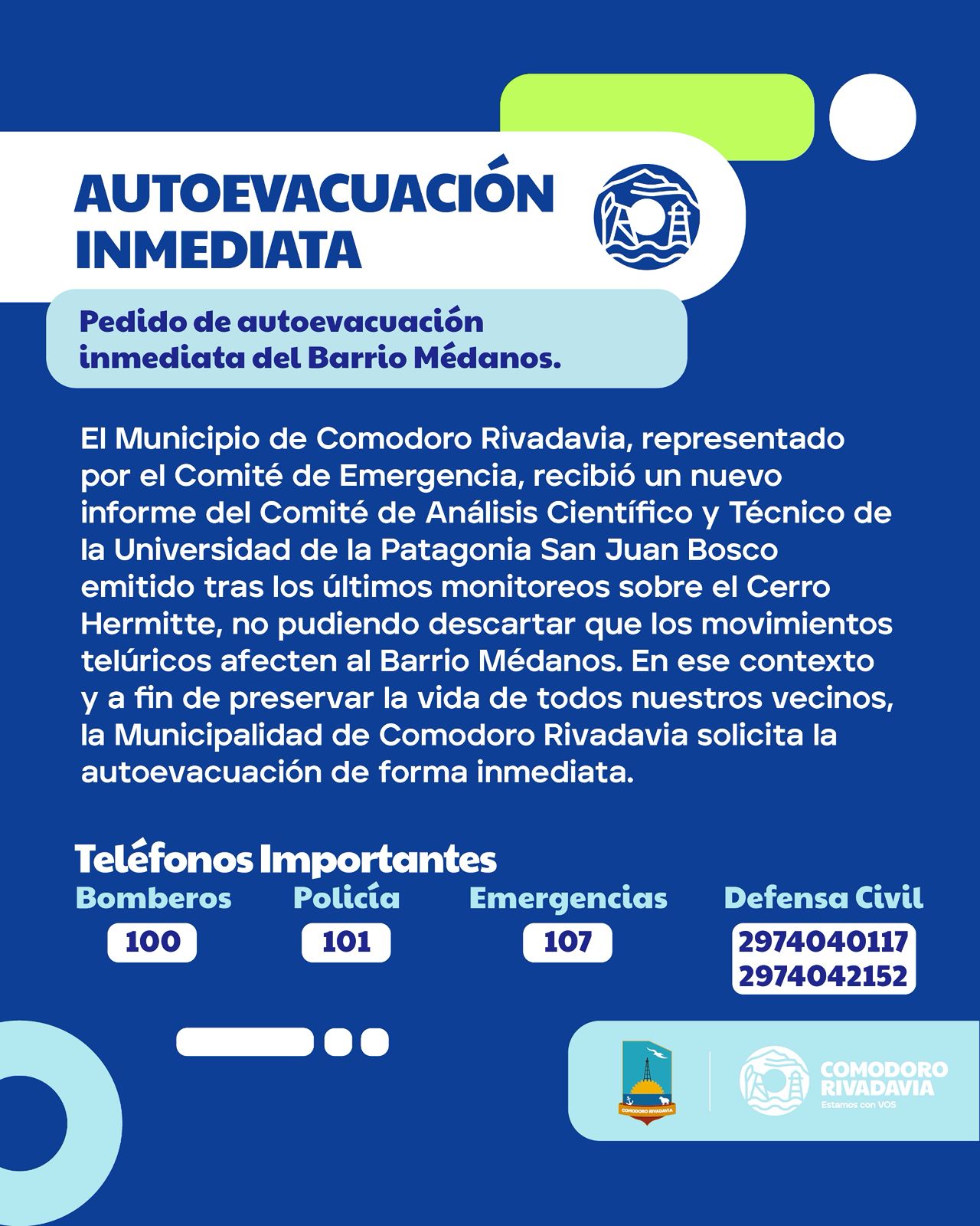 Comunicados Piden que barrio Médanos se autoevacúe 19 de enero de 2026 8:56 pm R360 Share 0 Min Read COMUNICADO OFICIAL: El Municipio informa la autoevacuación inmediata del barrio Médanos. Share This Article Facebook Twitter Whatsapp Whatsapp Copy Link Previous Article Caso Valeria Schwab: sin detenidos y convocan a una marcha con velas Next Article Orgullo Waiwen: Ernestina Lobo fue convocada a una observación de la Selección U-19