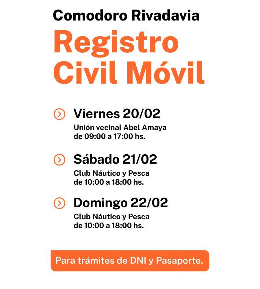 El Gobierno del Chubut, a través del Ministerio de Gobierno, informa que la Unidad Móvil de Documentación del Registro Civil realizará un operativo para la toma de trámites de DNI en la ciudad de Comodoro Rivadavia, durante el mes de febrero.