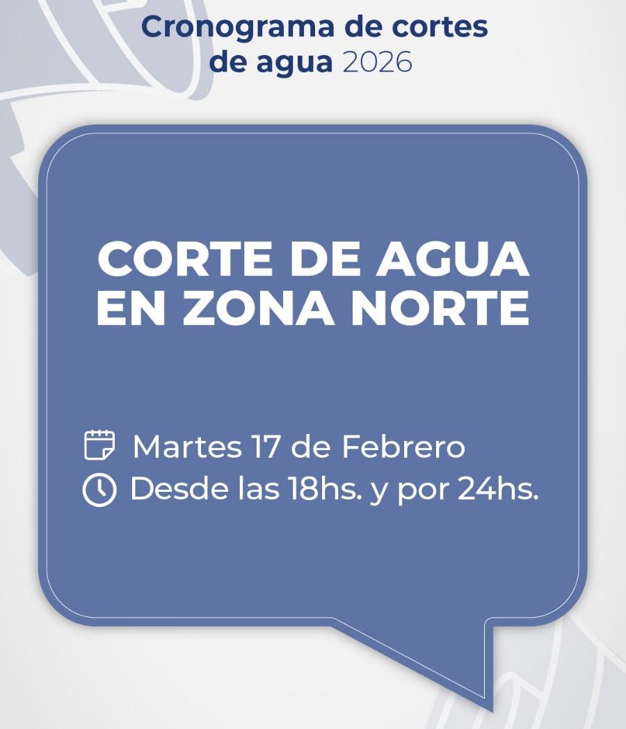 Hoy, martes 17 de febrero, desde las 18hs. y por un lapso de 24hs., se interrumpe el suministro de agua en Zona Norte para recuperar las reservas de Puesto La Mata.