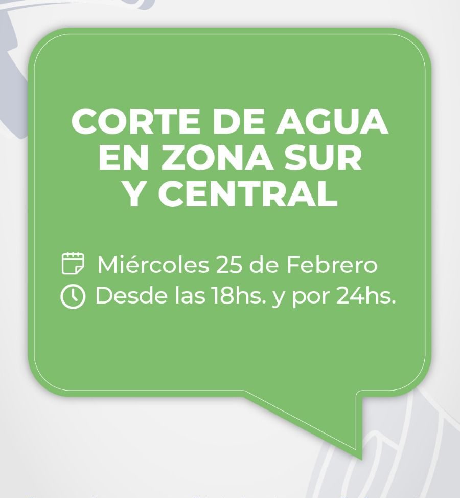 ⚠️Hoy, miércoles 25 de febrero, desde las 18hs. y por un lapso de 24hs., se interrumpe el suministro de agua en Zona Sur y Centro para recuperar las reservas de Puesto La Mata.