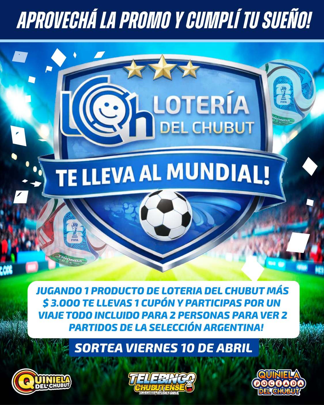 “Lotería te lleva al Mundial” es el nombre de la iniciativa que propone una forma simple de participar: quienes jueguen cualquiera de los productos oficiales de Lotería del Chubut -como Quiniela del Chubut, Telebingo Chubutense o La Poceada- podrán agregar 3.000 pesos a su jugada y recibirán un cupón para inscribirse en el sorteo.
