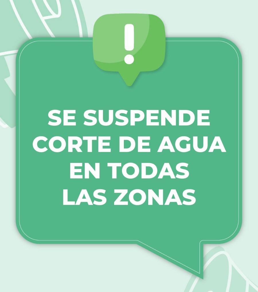 Hoy, viernes 13 de marzo, se suspende el corte programado de agua en Zona Norte; y mañana, sábado 14, se suspende el corte programado en Zona Sur y Central, por encontrarse las reservas de Puesto La Mata en condiciones de operación aceptables.