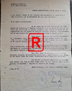 En mi condición de Jefe Accidental del Regimiento de Infantería 8 “General O’HIGGINS” y a dos meses de haberse iniciado las operaciones en nuestro Atlántico Sur, siento la necesidad de comunicarme con los padres de nuestros heroicos Soldados, interpretando así el sentimiento de todos sus Jefes, Oficiales y Suboficiales.