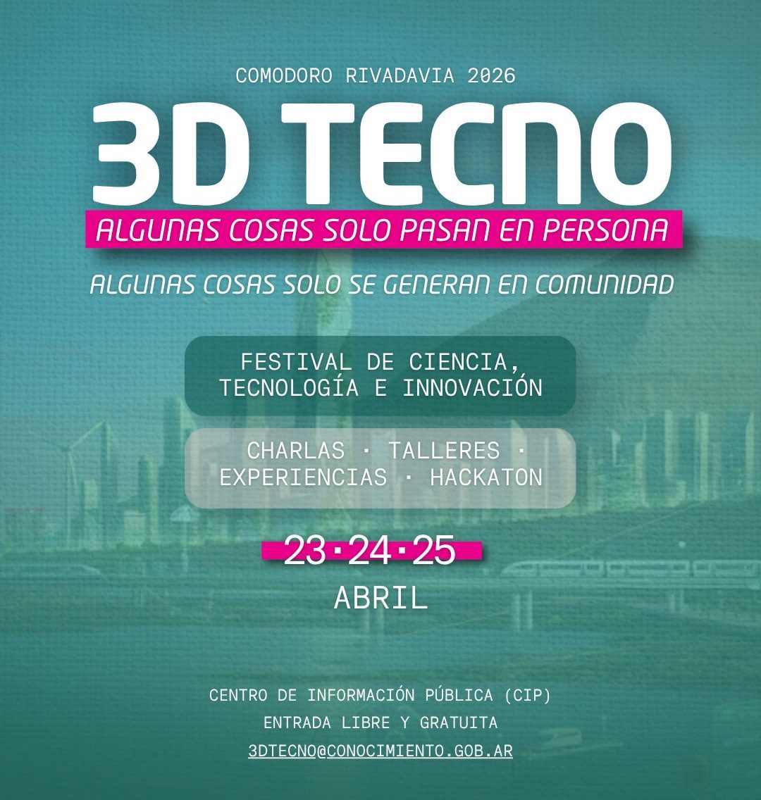 Durante tres jornadas, del jueves 23 al sábado 25 de abril, el Festival 3D Tecno ofrecerá una agenda diversa que incluye charlas, paneles, talleres, experiencias interactivas, espacios de networking y la segunda edición del hackatón local “Ciudad Futura”, donde equipos multidisciplinarios desarrollarán soluciones a desafíos reales de la ciudad.